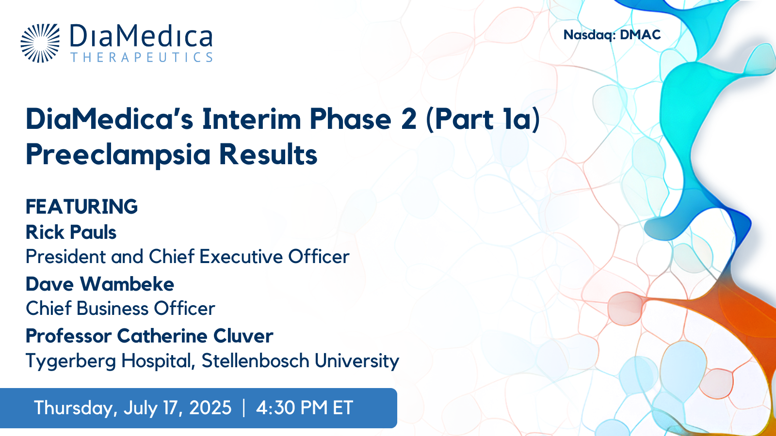 DiaMedica Therapeutics is committed to improving the lives of individuals battling serious vascular diseases by developing innovative therapies that reduce ischemia. With an initial focus on preeclampsia (PE), fetal growth restriction (FGR) and acute ischemic stroke (AIS), we are dedicated to advancing patient care through a novel approach that centers around reversing the effects of the ischemic injury to improve patient outcomes.