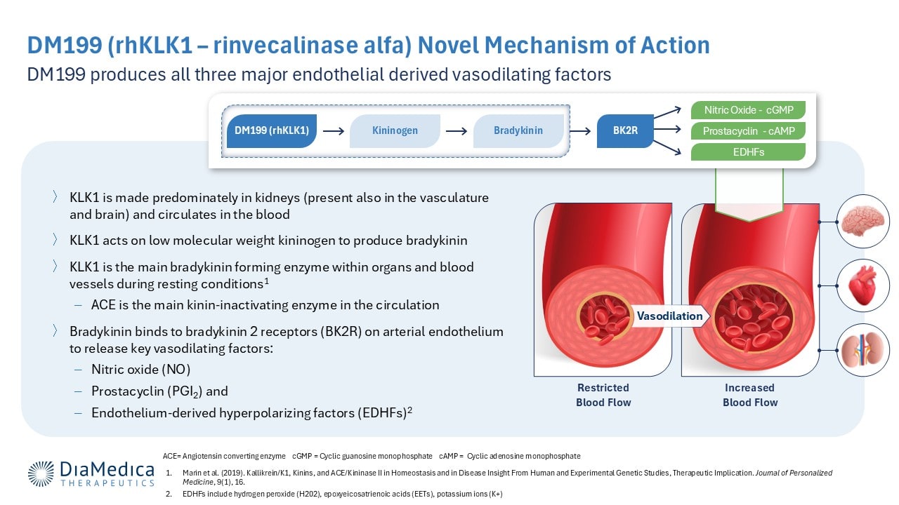 DiaMedica Therapeutics is developing DM199 (rhKLK1), a recombinant protein replacement therapy intended to restore normal, healthy levels of human tissue kallikrein-1 (KLK1). KLK1 is a naturally occurring protein believed to stimulate the production of key vasodilating signaling molecules that help to increase blood flow and improve endothelial health. Through this novel mechanism, DM199 may have the potential to treat several ischemic conditions, including preeclampsia, fetal growth restriction, and acute ischemic stroke.