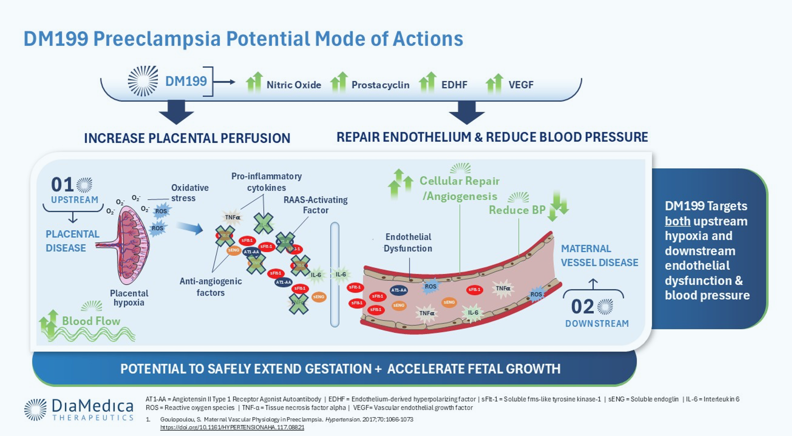 DiaMedica is collaborating with world leaders from Stellenbosch University, the University of Melbourne, and the University of Gothenburg who are conducting an investigator-sponsored trial. The interim Part 1a results are highly encouraging and demonstrate the best-in-class potential of DM199 as an effective therapeutic for preeclampsia. DM199 exhibited a favorable safety profile, with no placental transfer and no serious treatment-emergent adverse events reported. DM199 also produced clinically meaningful and statistically significant, dose-dependent reductions in both systolic and diastolic blood pressure across multiple timepoints. Additionally, DM199 achievedc a statistically significant improvement in uterine artery pulsatility index at the 2-hour assessment, indicating its potential for enhanced placental perfusion and disease modification.